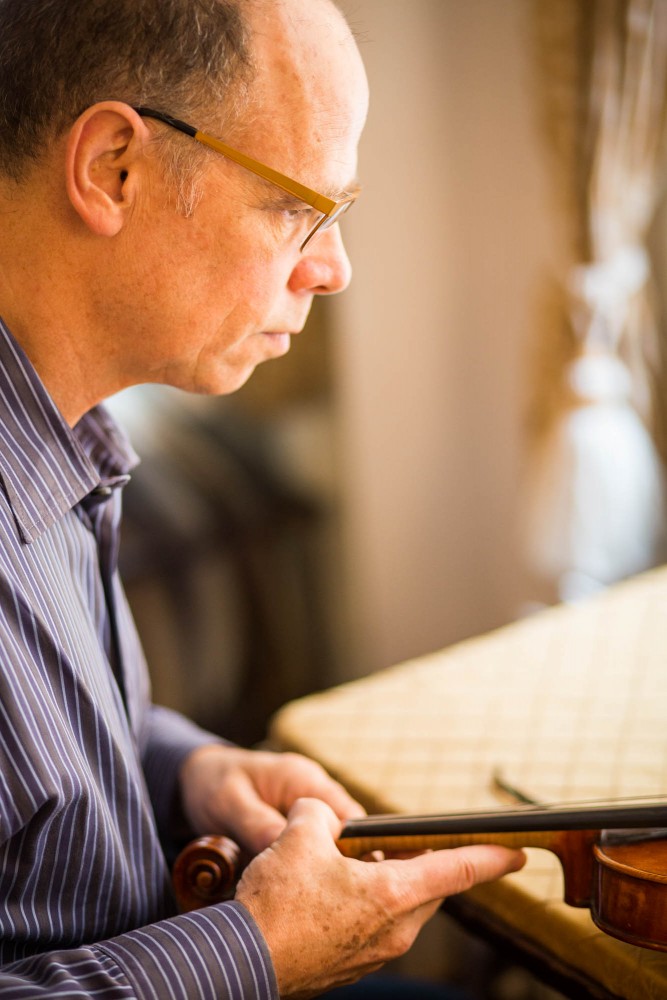 ‘Restoration fascinates me because with every instrument one has to face new challenges.[…] I am very happy to work on an old instrument, which has survived hundreds of years and discover its story, and learn how it was created. I try to meet the standards of the original workmanship by saving original material wherever possible, and at the same time adapting it to be optimally played by musicians in the future. My restoration work is balanced with the making of new violins.   In this domain, the style, technique and instrument model are all my own choice.  Classical masters inspire me and the constant study of their work is very helpful. However, I also have my own style, which is influenced by other art forms and the time I live in. In this way, I give the instrument its own character, so it will both challenge and encourage a musician.